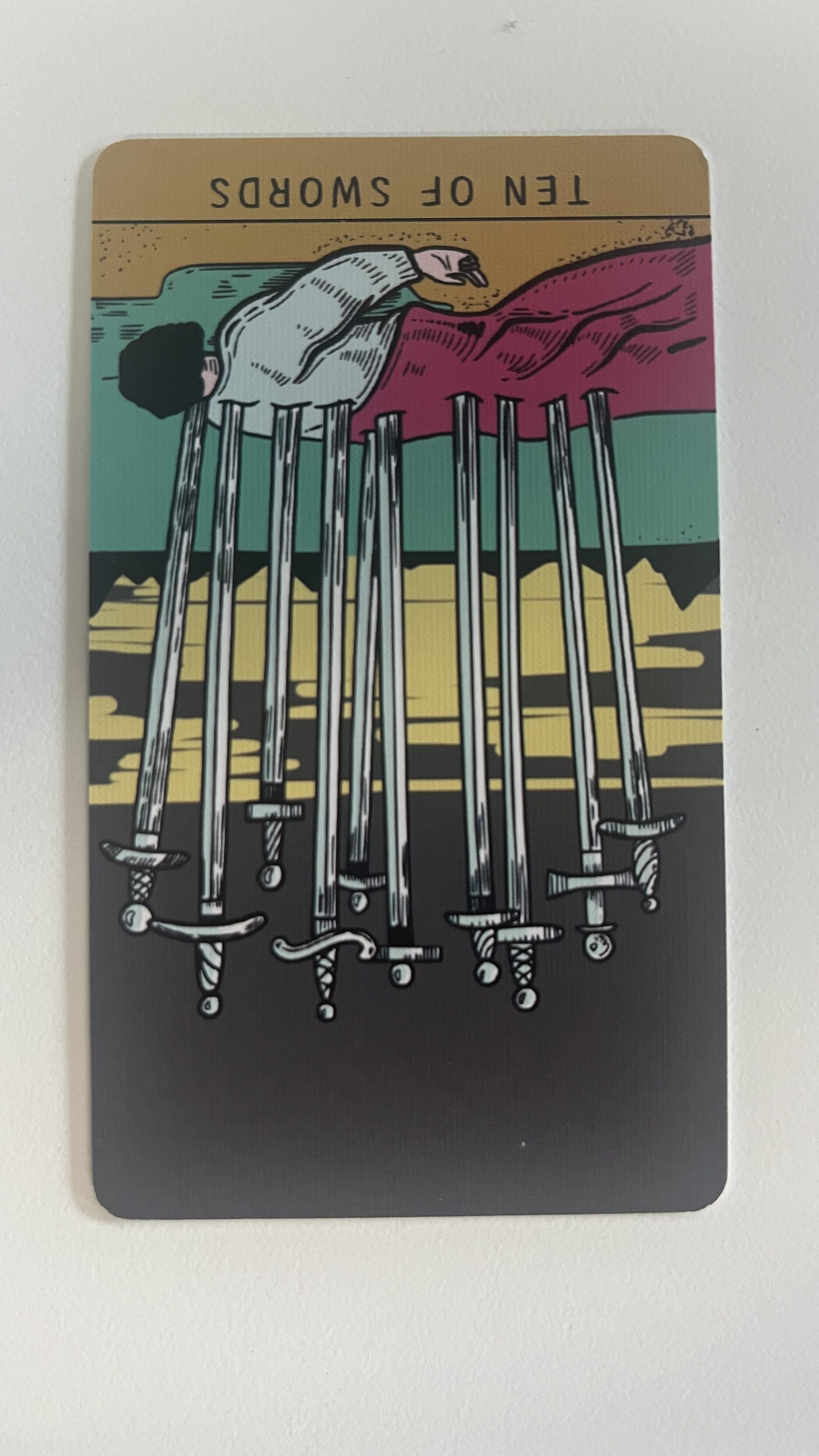 但所幸我今天抽到的是逆位的宝剑十,在宝剑系列中比较后面的一张。本来看起来被一阵很强又混乱的力量彻底打败了,而逆位后看起来像是被这股力量挑起来变成了烧烤。